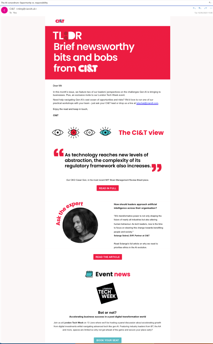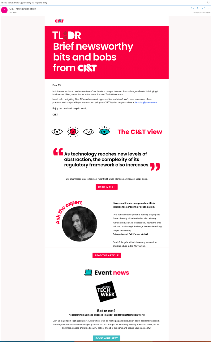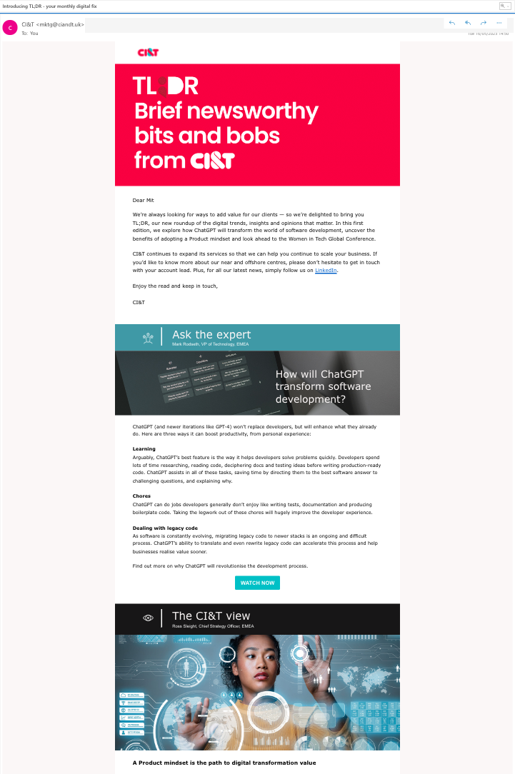 In Q1 2023, CI&T launched TL;DR: its first EMEA email newsletter designed to add value to client relationships and drive business growth.