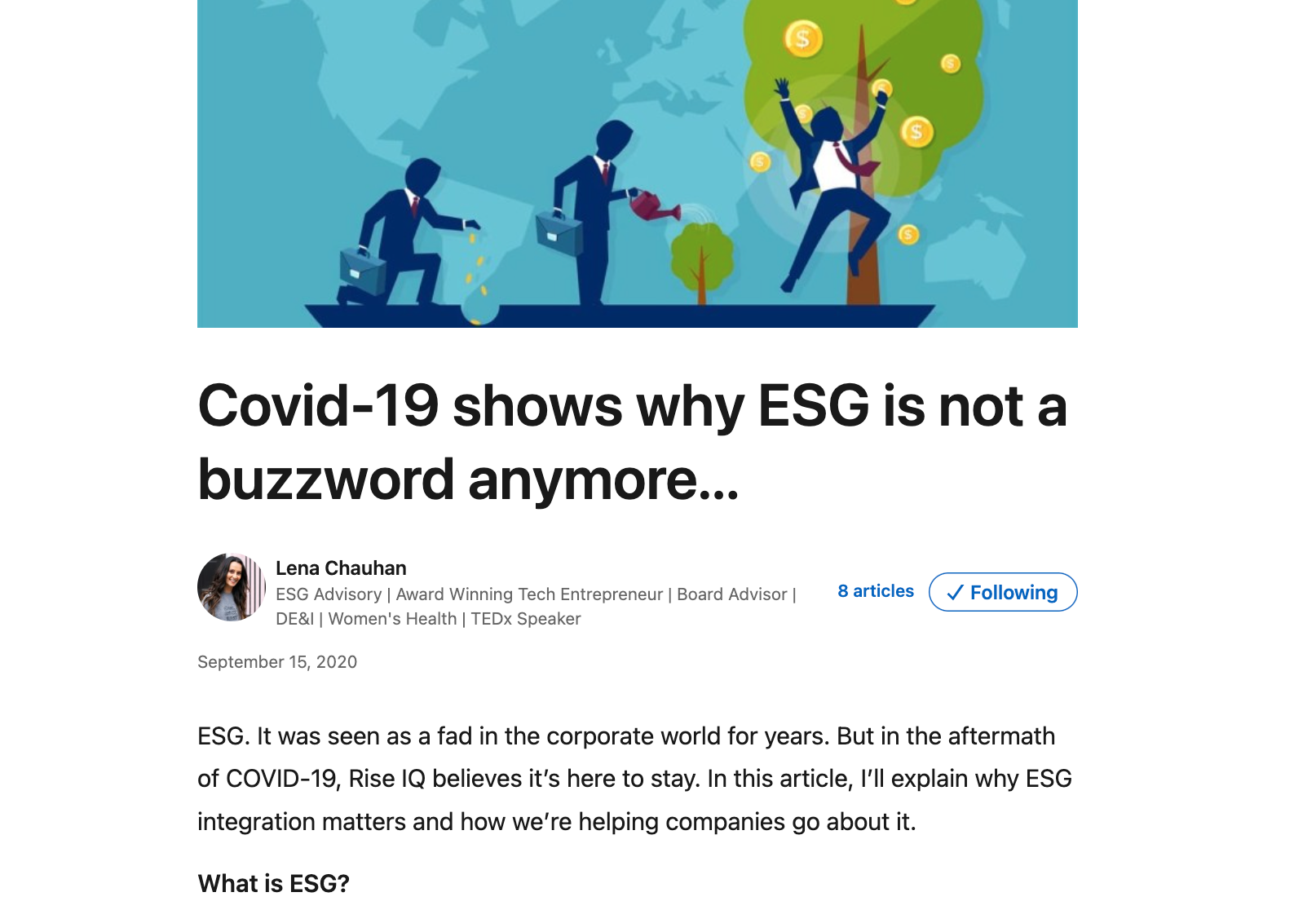 ESG stands for environmental, social and governance. As founder of ESG consultancy Rise IQ, Lena Chauhan helps enterprise businesses shape their ESG strategy, with a focus on the social pillar.