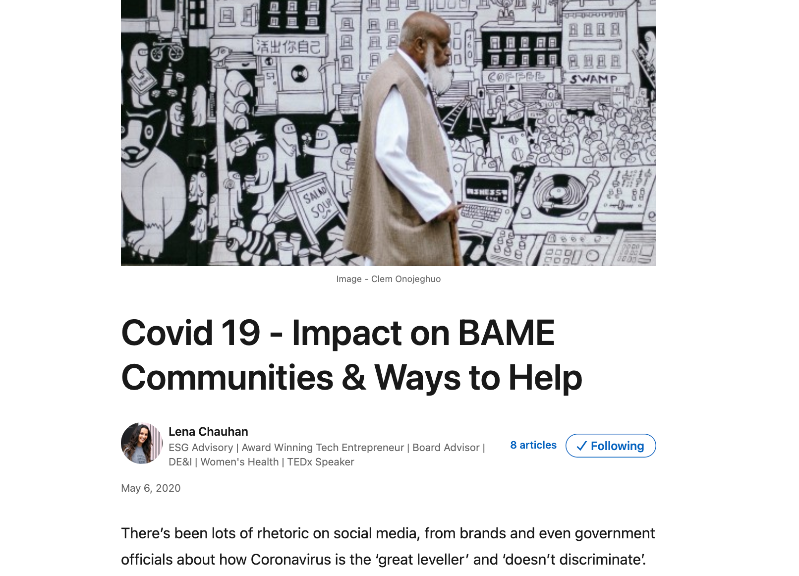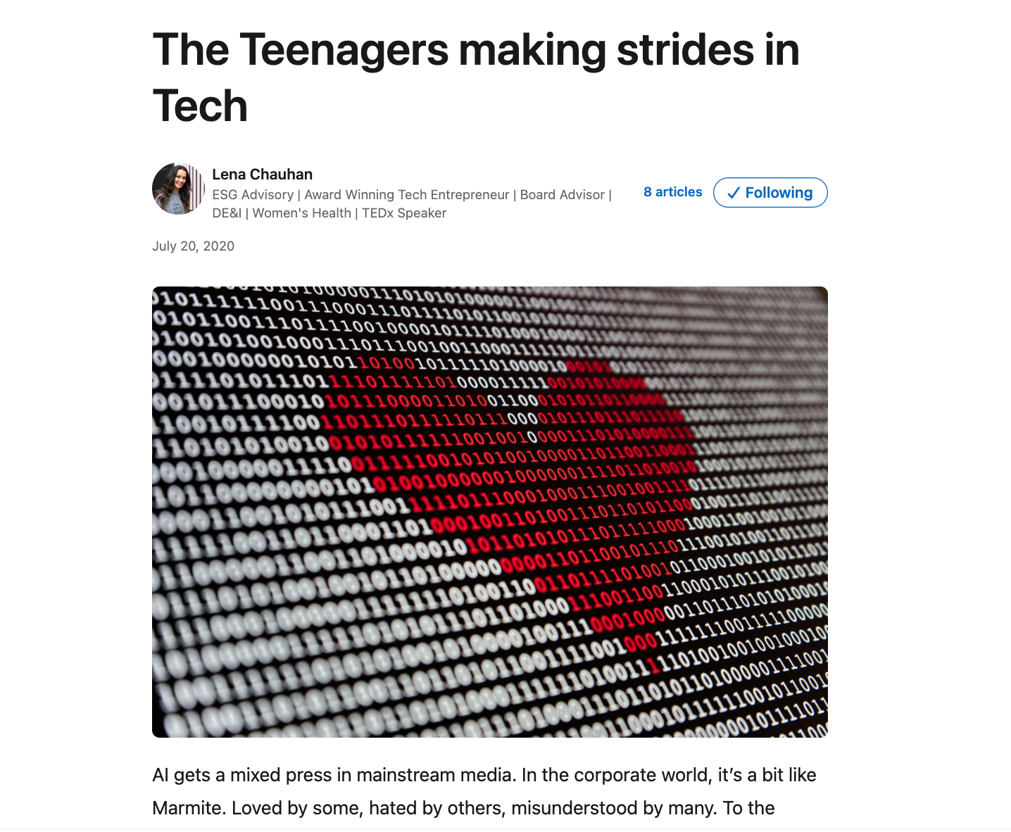 In summer 2020, she wanted to raise her brand profile by spotlighting three key initiatives: support networks for BAME communities during Covid-19, her role in the Teens in AI movement, and her work demystifying ESG for business.