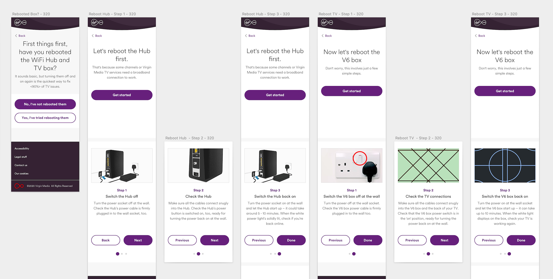 As senior UX writer, I partnered with designers, product owners and clients to test new online self-serve journeys – ranging from TV troubleshooting guides to product propositions.
